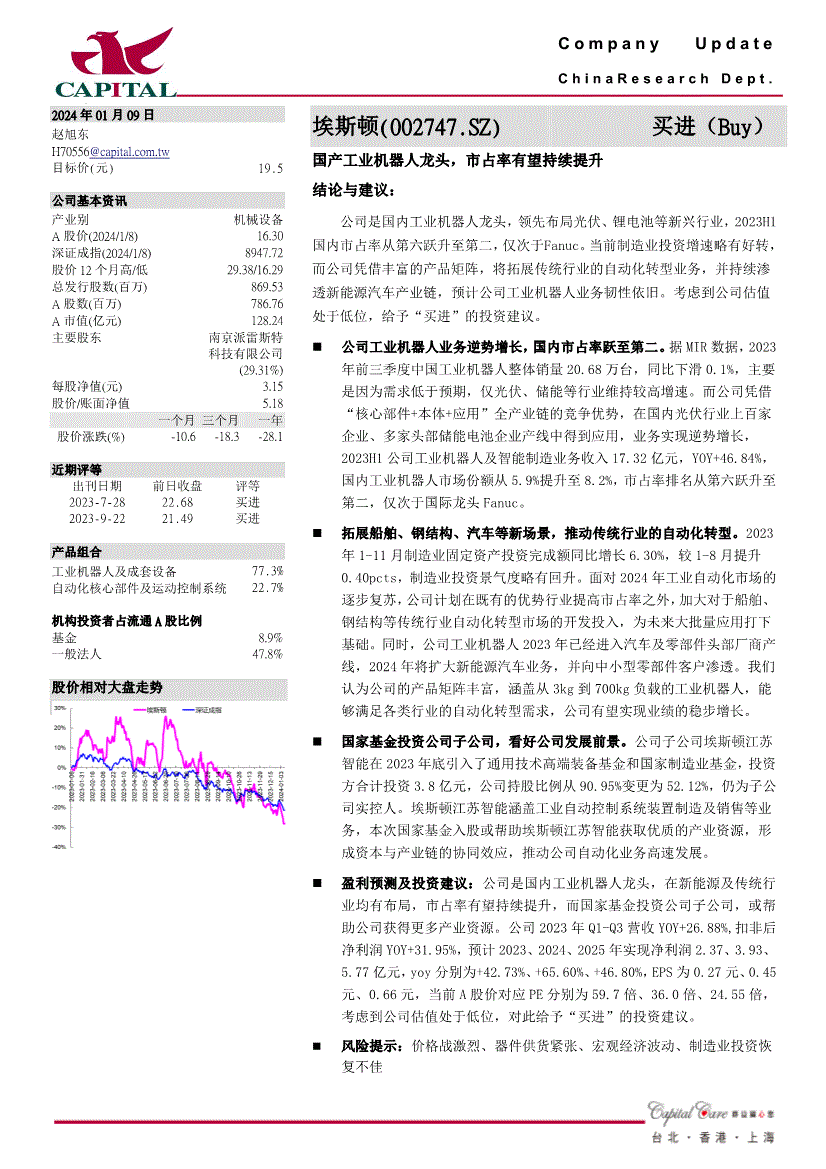 C o m p a n y U p d a t e C h i n a R e s e a r c h D e p t 。 阿2024年01月09日赵旭东方针价(元) 19。5 公司根基资讯财产别机械设备A股价(2024/1/8) 16。30 深证成指(2024/1/8) 8947。72 股价12个月高/低29。38/16。29 总刊行股数(百万) 869。53 A股数(百万) 786。76 A市值(亿元) 128。24 次要股东南京派雷斯特科技无限公司(29。31%) 每股净值(元) 3。15 股价/账面净值5。18 一个月三个月一年股价涨跌(%) -10。6 -18。3 -28。1 近期评等出刊日期2023-7-28 2023-9-22 前日收盘22。68 21。49 评等买进买进产物组合工业机械人及成套设备77。3% 从动化焦点部件及活动节制系统22。7% 机构投资者占畅通A股比例基金8。9% 一般法人47。8% 股价相对大盘走势埃斯顿(002747。SZ)买进(Buy) 国产工业机械人龙头,市占率无望持续提拔结论取:公司是国内工业机械人龙头,领先结构光伏、锂电池等新兴行业,2023H1国内市占率从第六跃升至第二,仅次于Fanuc。