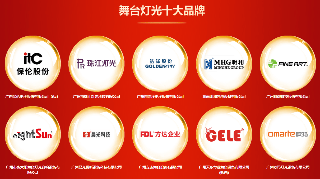 恭喜以下获企业:广东保伦电子股份无限公司(itc)、广州市珠江灯光科技无限公司、广州市浩洋电子股份无限公司、湖南明和光电设备无限公司、广州彩熠科技股份无限公司、广州市夜太阳舞台灯光声响设备无限公司、广州晨曦视听设备科技无限公司、广州方达舞台设备无限公司、广州天歌专业舞台设备无限公司(歌乐)、广州欧玛灯光设备无限公司(排名不分先后)。