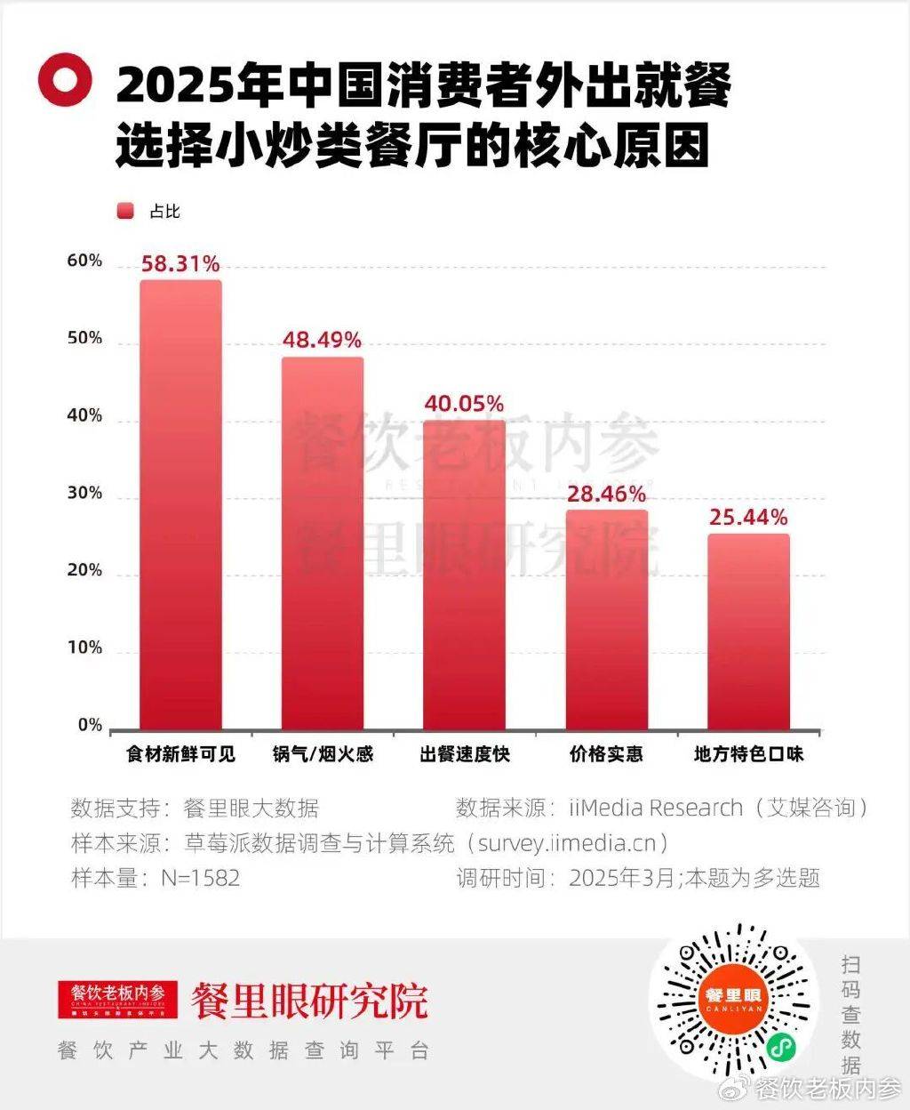 近年来消费者对预制菜的发急情感,催生了对“现炒”兴旺的需求。艾媒征询数据显示:正在2025年中国消费者选择小炒类餐厅的焦点缘由中,食材新颖可见、锅气/炊火感、出餐速度快,这几点位列前三。