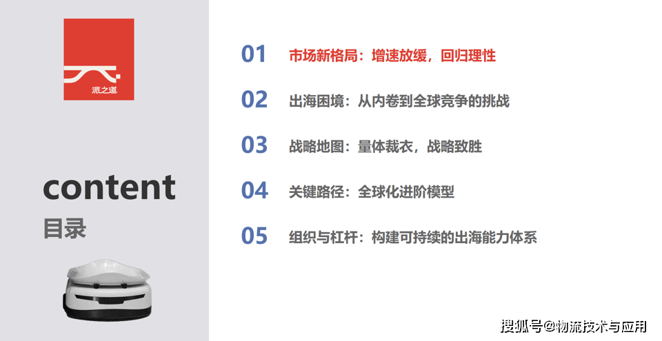 本文基于对中国物流机械人企业出海实践的深切察看取系统阐发,提出了一套完整的计谋演进框架。文章从意从手艺导向转向场景驱动、从低价合作转向价值共创、从单点冲破转向生态协同的计谋升维径。我们建立了聚焦亚太、冲破欧美、引领全球的三阶段全球化进阶模子,并从组织能力、跨文化协做、合做伙伴选择及风险管控等多个维度,深切切磋若何建立可持续的出海能力系统。本文旨正在为中国物流机械人企业供给切实可行的全球化成长思,帮力其正在全球市场中成立持久合作劣势。
